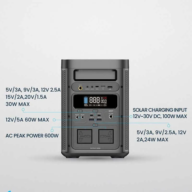 این دستگاه با ظرفیت بالای 90000mAh (288Wh) گزینهای ایدهآل برای کمپینگ، سفر، میهمانیهای فضای باز و استفاده خانگی است. با توان خروجی 300 وات مداوم و 600 وات در حالت اوج، میتوانید همزمان چندین وسیله مانند لپتاپ، چراغ، تلفن همراه و اسپیکر را به راحتی تغذیه کنید.